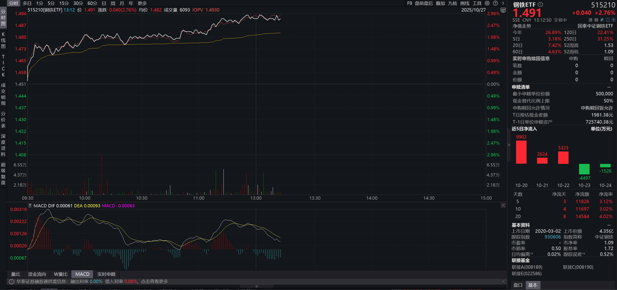 10月27日午盘,钢铁产业放量大涨,全市场唯一钢铁ETF(515210)涨幅超2%,资金抢筹布局,近5日净流入超1亿元。