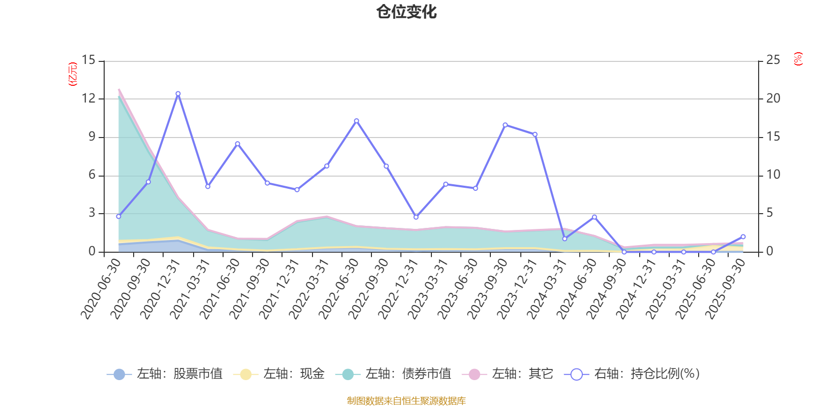 据定期报告数据统计,近三年平均股票仓位为5.17%,同类平均为18.94%。2020年末基金达到20.72%的最高仓位,2024年一季度末最低,为1.73%。