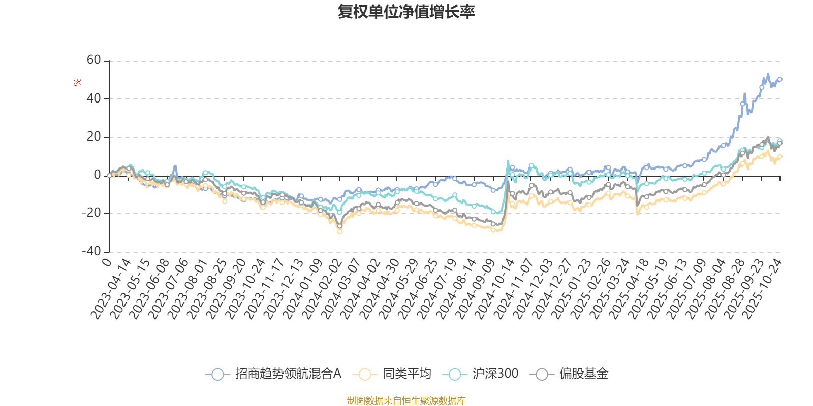 截至10月24日,招商趋势领航混合A近三个月复权单位净值增长率为33.77%,位于同类可比基金54/621;近半年复权单位净值增长率为44.77%,位于同类可比基金98/618;近一年复权单位净值增长率为47.03%,位于同类可比基金122/611。