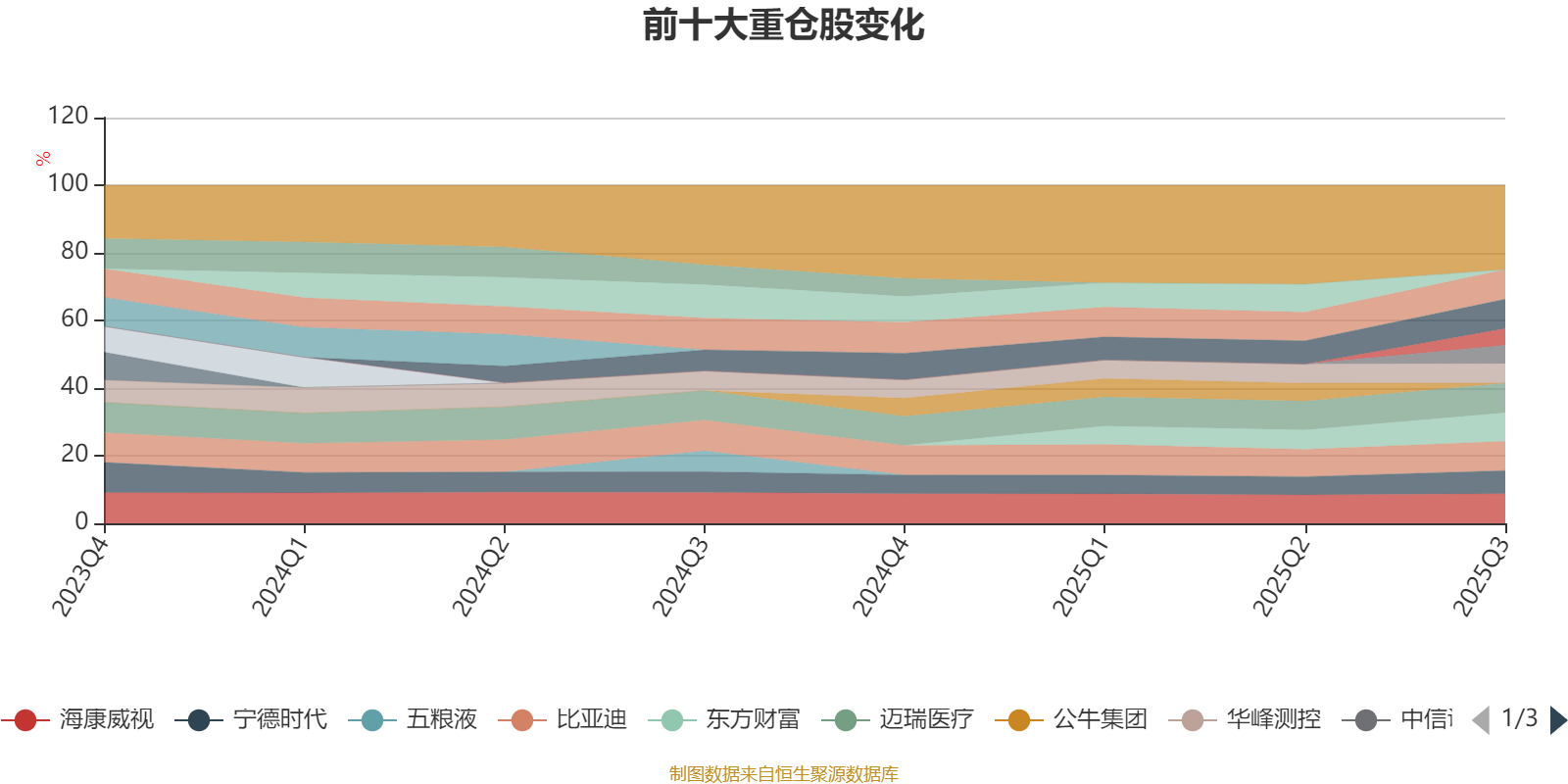 该基金持股集中度较高,近2年前十大重仓股集中度长期超过60%。截至2025年三季度末,基金十大重仓股分别是迈瑞医疗、海康威视、柏楚电子、比亚迪、中芯国际、东方财富、宁德时代、华峰测控、中信证券、传音控股。