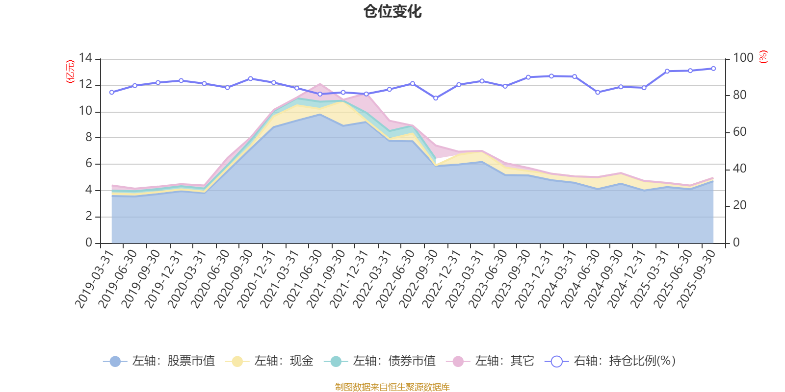 据定期报告数据统计,近三年平均股票仓位为88.55%,同类平均为85.51%。2025年三季度末基金达到94.74%的最高仓位,2022年三季度末最低,为78.7%。