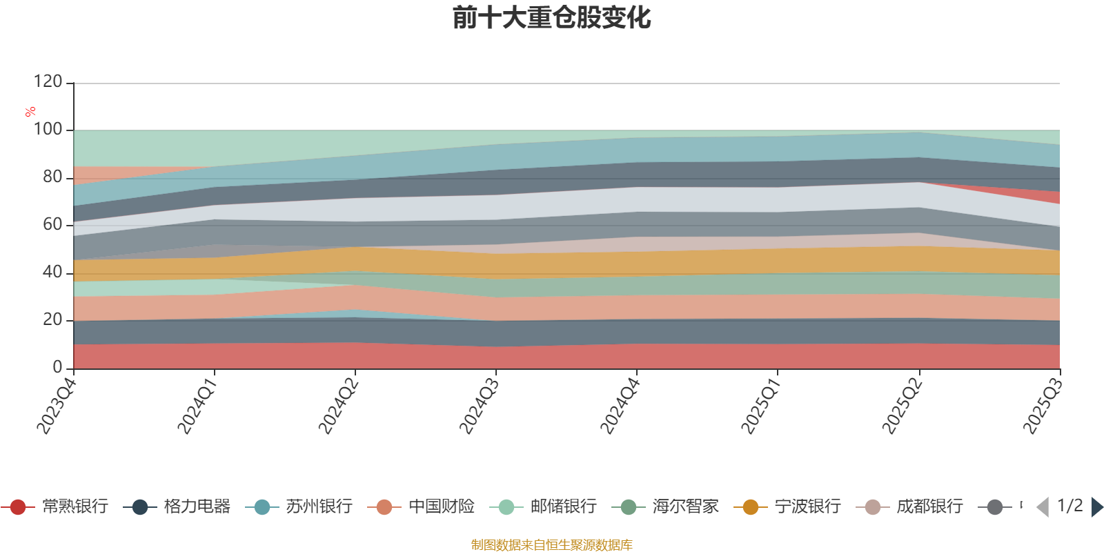 该基金持股集中度较高,且持股标的较为稳定,近2年前十大重仓股集中度长期超过60%。截至2025年三季度末,基金十大重仓股分别是宁波银行、格力电器、美的集团、招商银行、常熟银行、海尔智家、中国平安、中国太保、中国财险、中国国航。