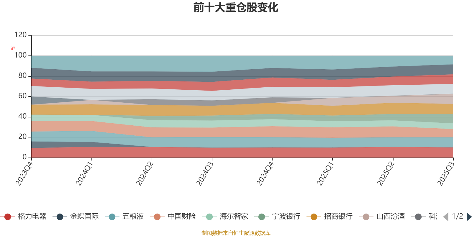 该基金持股集中度较高,且持股标的较为稳定,近2年前十大重仓股集中度长期超过60%。截至2025年三季度末,基金十大重仓股分别是格力电器、山西汾酒、五粮液、招商银行、贵州茅台、美的集团、中国平安、宁波银行、中国财险、海尔智家。
