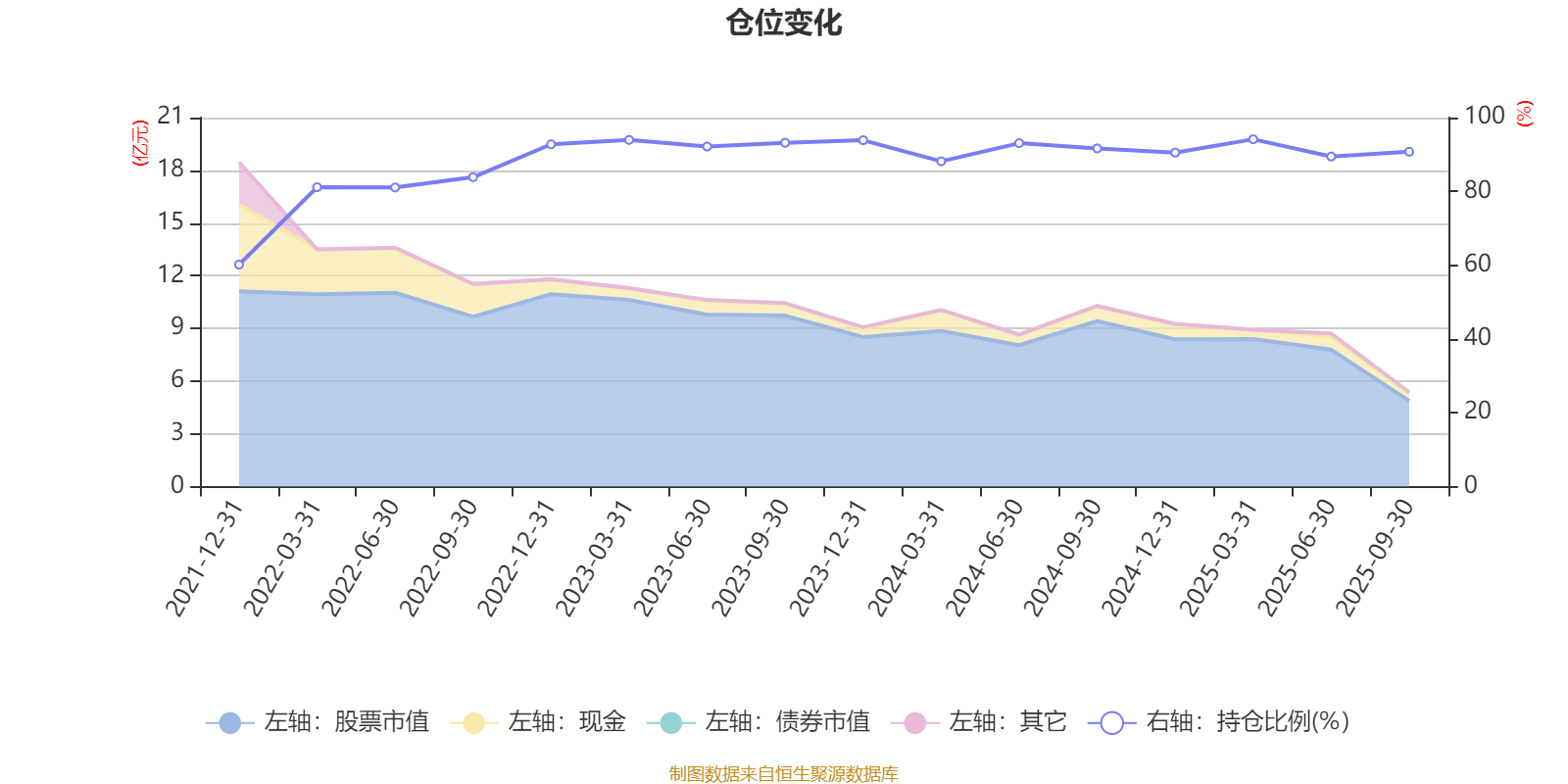 据定期报告数据统计,近三年平均股票仓位为91.97%,同类平均为87.17%。2025年一季度末基金达到94.13%的最高仓位,2021年末最低,为60.17%。