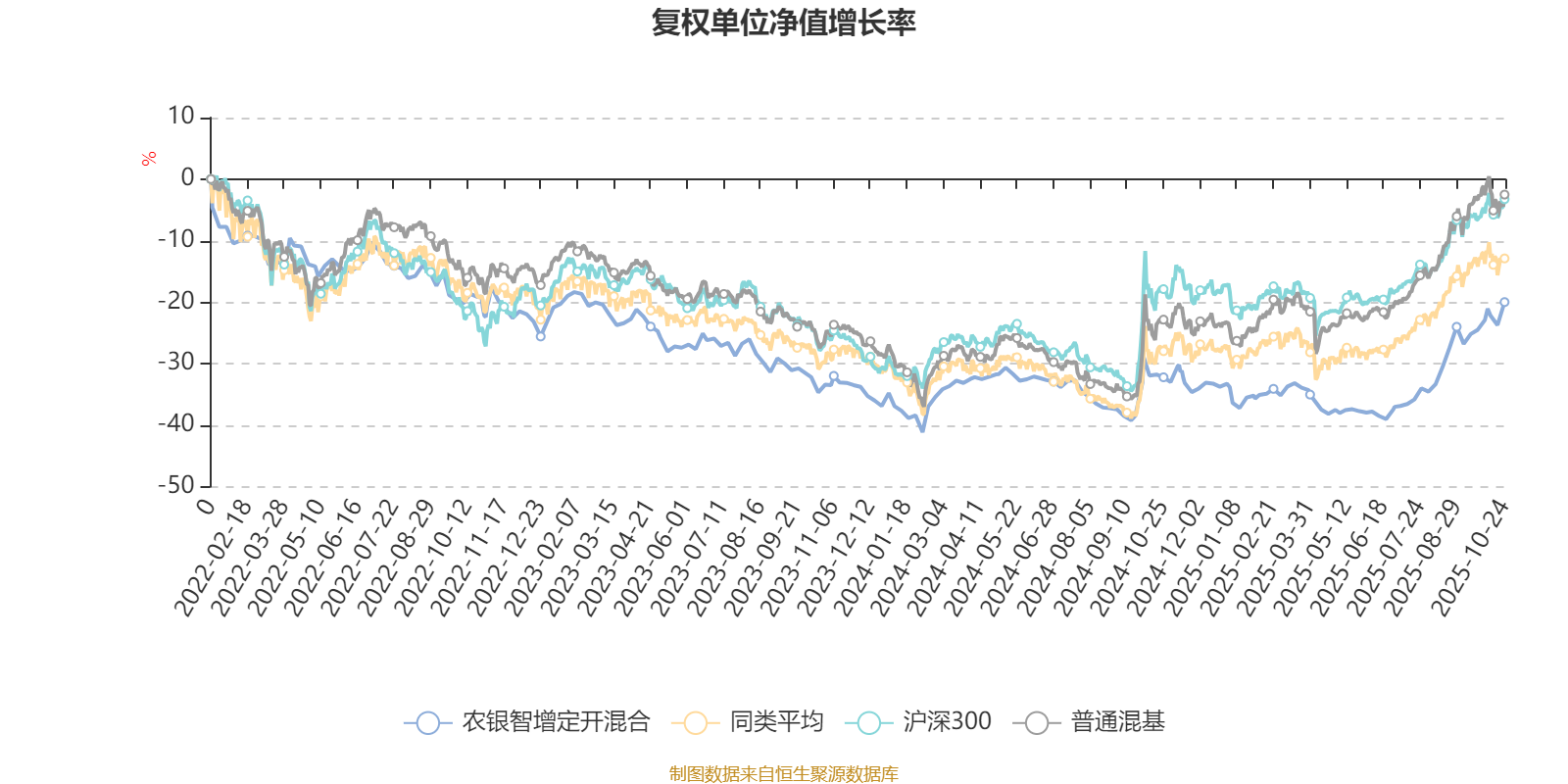 截至10月24日,农银智增定开混合近三个月复权单位净值增长率为24.70%,位于同类可比基金16/134;近半年复权单位净值增长率为29.39%,位于同类可比基金37/134;近一年复权单位净值增长率为17.28%,位于同类可比基金70/130;近三年复权单位净值增长率为-1.07%,位于同类可比基金98/119。