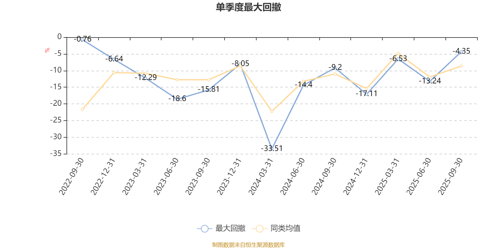 截至10月24日,基金近三年最大回撤为37.99%,同类可比基金排名33/75。单季度最大回撤出现在2024年一季度,为33.51%。