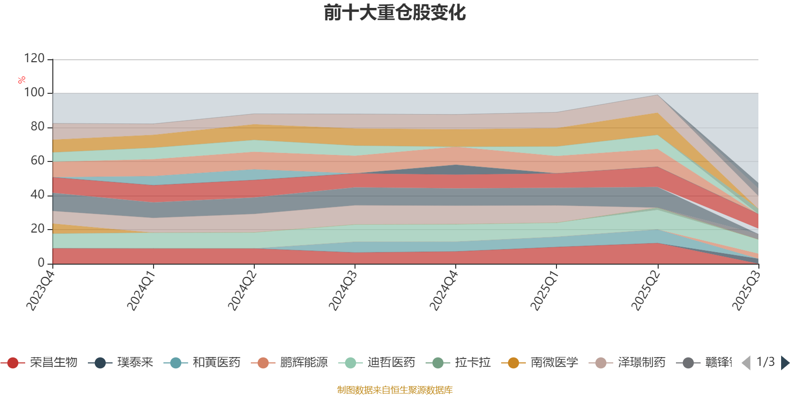 且持股标的较为稳定。截至2025年三季度末,基金十大重仓股分别是首药控股、迪哲医药、海创药业、派能科技、天赐材料、赣锋锂业、亿纬锂能、我武生物、鹏辉能源、璞泰来。