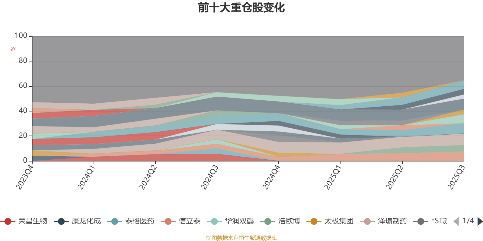 截至2025年三季度末,基金十大重仓股分别是泽璟制药、恒瑞医药、科伦药业、信立泰、药明康德、热景生物、浩欧博、益方生物、悦康药业、新诺威。
