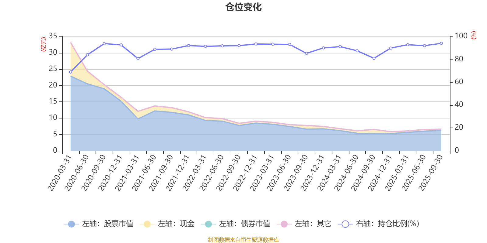 据定期报告数据统计,近三年平均股票仓位为90.24%,同类平均为86.81%。2025年三季度末基金达到93.99%的最高仓位,2020年一季度末最低,为68.93%。
