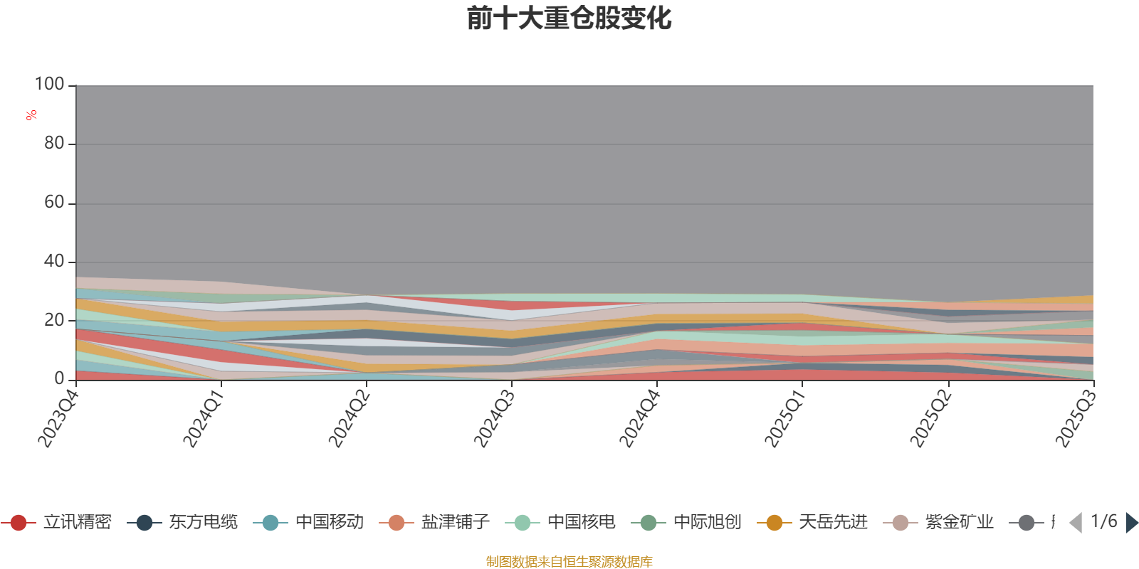 截至2025年三季度末,基金十大重仓股分别是宁德时代、中国平安、寒武纪、中际旭创、中国太保、恺英网络、银轮股份、广发证券、复旦微电、紫金矿业。