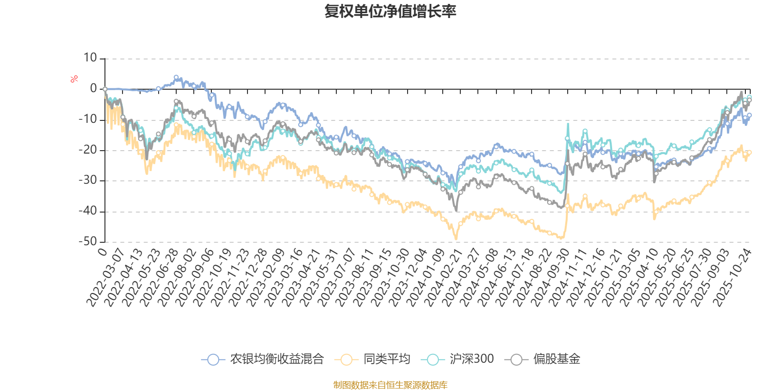 截至10月24日,农银均衡收益混合近三个月复权单位净值增长率为14.49%,位于同类可比基金298/621;近半年复权单位净值增长率为20.65%,位于同类可比基金441/618;近一年复权单位净值增长率为13.12%,位于同类可比基金513/611;近三年复权单位净值增长率为-1.78%,位于同类可比基金411/518。