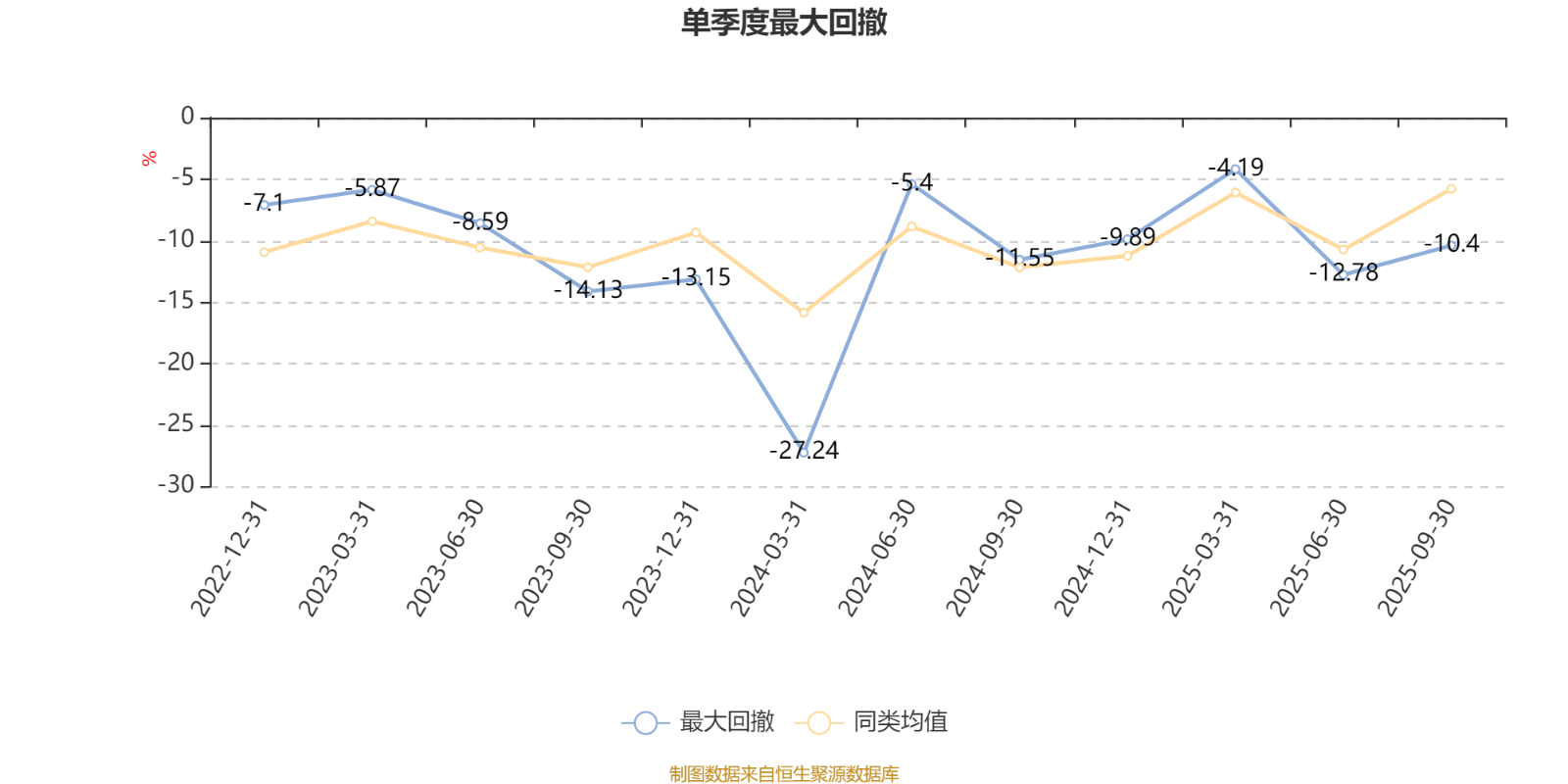 截至10月24日,基金近三年最大回撤为46.36%,同类可比基金排名302/365。单季度最大回撤出现在2024年一季度,为27.24%。