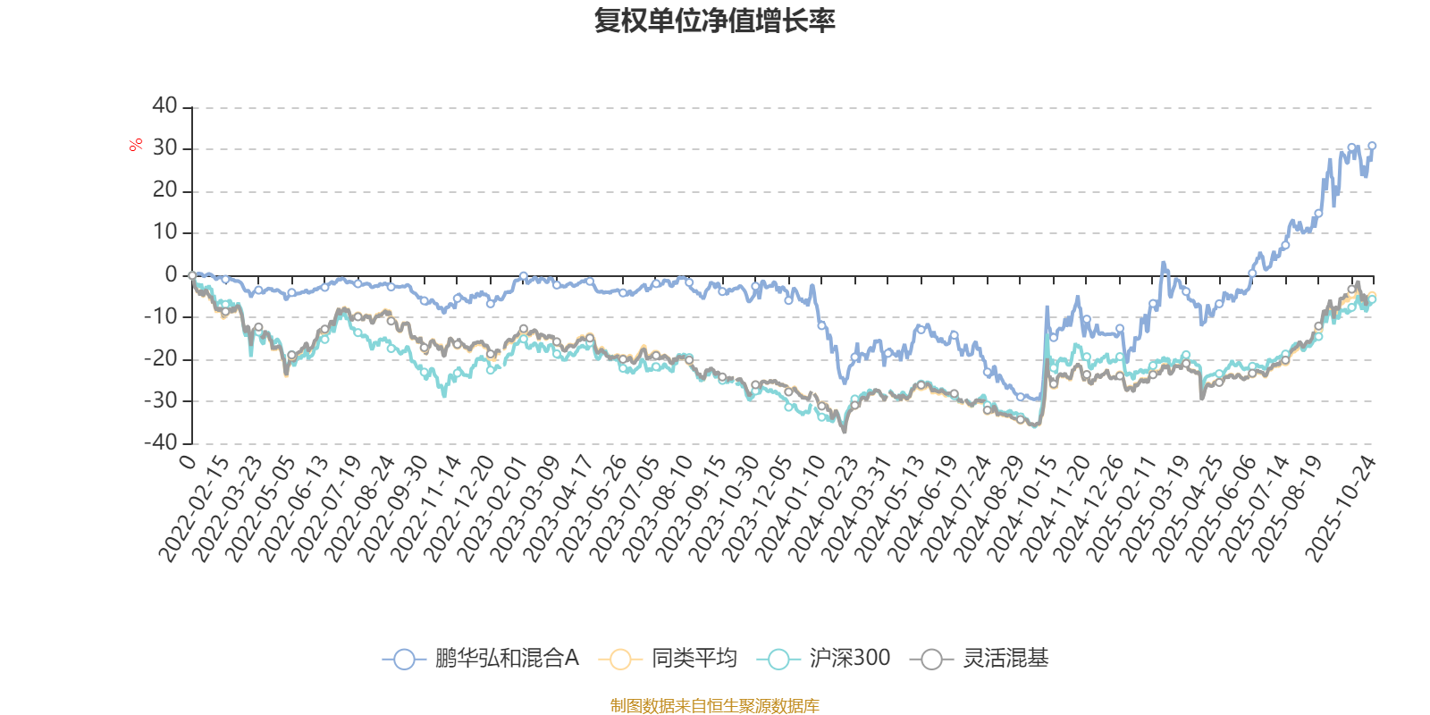 截至10月24日,鹏华弘和混合A近三个月复权单位净值增长率为16.88%,位于同类可比基金437/1287;近半年复权单位净值增长率为40.90%,位于同类可比基金222/1287;近一年复权单位净值增长率为50.14%,位于同类可比基金147/1287;近三年复权单位净值增长率为41.94%,位于同类可比基金175/1286。
