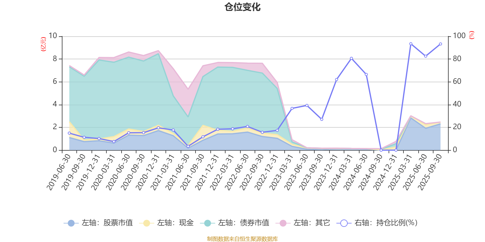 据定期报告数据统计,近三年平均股票仓位为49.92%,同类平均为72.16%。2025年一季度末基金达到93.46%的最高仓位,2021年上半年末最低,为3.41%。