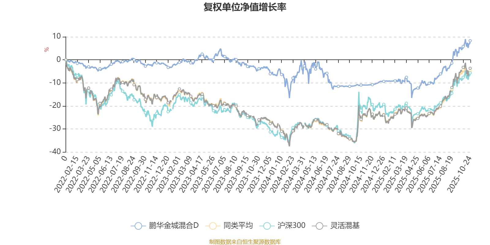 截至10月24日,鹏华金城混合D近三个月复权单位净值增长率为11.49%,位于同类可比基金629/1287;近半年复权单位净值增长率为23.47%,位于同类可比基金621/1287;近一年复权单位净值增长率为21.58%,位于同类可比基金643/1287;近三年复权单位净值增长率为10.80%,位于同类可比基金717/1286。
