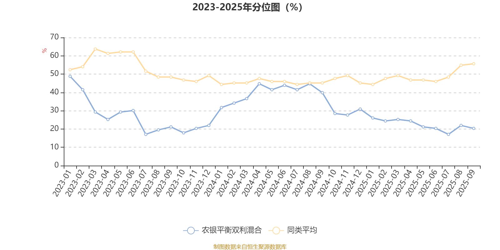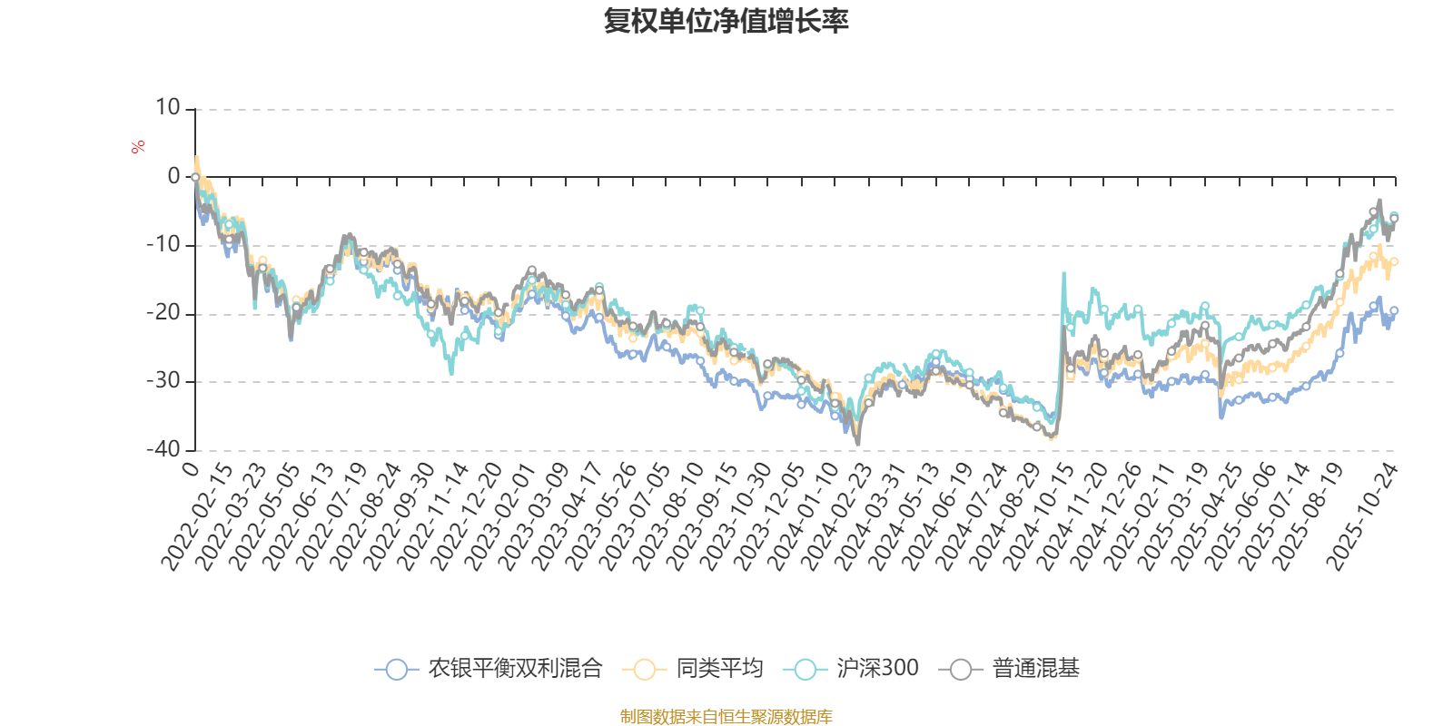 截至10月24日,农银平衡双利混合近三个月复权单位净值增长率为13.66%,位于同类可比基金50/134;近半年复权单位净值增长率为19.36%,位于同类可比基金71/134;近一年复权单位净值增长率为11.77%,位于同类可比基金92/130;近三年复权单位净值增长率为-1.32%,位于同类可比基金99/119。