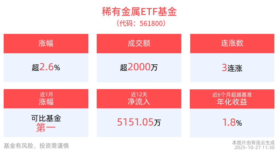 流动性方面,稀有金属ETF基金换手10.16%,半日成交2595.75万元,市场交投活跃。资金流入方面,拉长时间看,稀有金属ETF基金近12个交易日内,合计“吸金”5151.05万元。