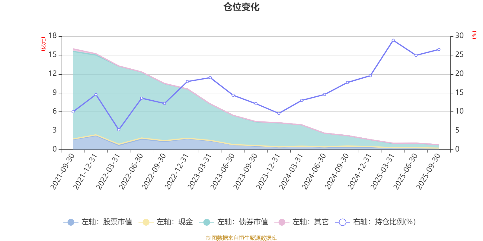 据定期报告数据统计,近三年平均股票仓位为18.19%,同类平均为19.03%。2025年一季度末基金达到28.92%的最高仓位,2022年一季度末最低,为5.23%。