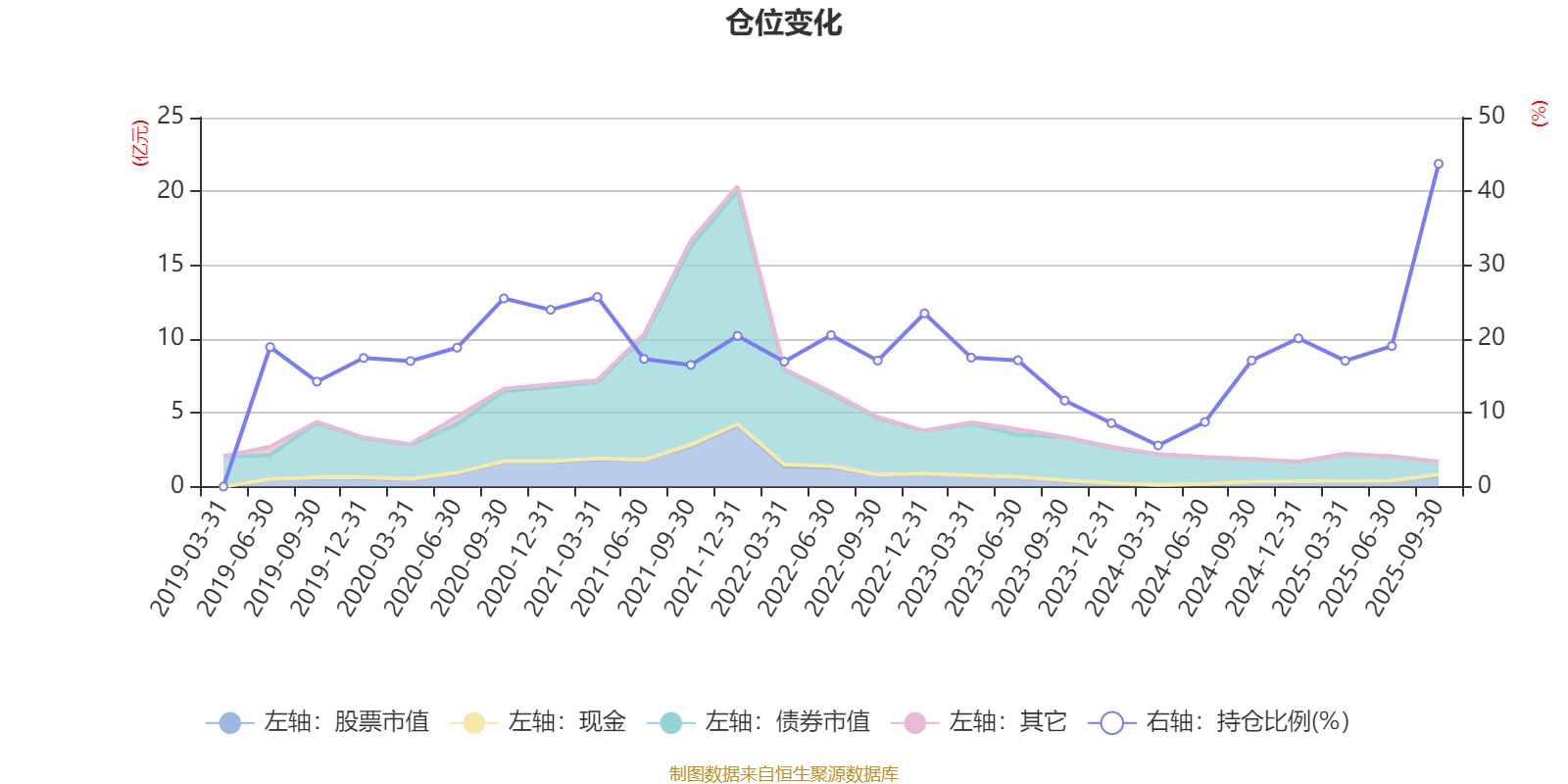 据定期报告数据统计,近三年平均股票仓位为17.47%,同类平均为72.19%。2025年三季度末基金达到43.74%的最高仓位,2024年一季度末最低,为5.57%。
