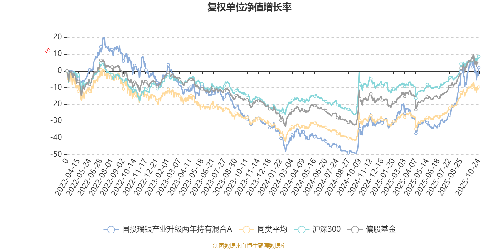 截至10月24日,国投瑞银产业升级两年持有混合A近三个月复权单位净值增长率为35.55%,位于同类可比基金48/621;近半年复权单位净值增长率为49.30%,位于同类可比基金71/618;近一年复权单位净值增长率为53.63%,位于同类可比基金79/611;近三年复权单位净值增长率为1.60%,位于同类可比基金374/518。