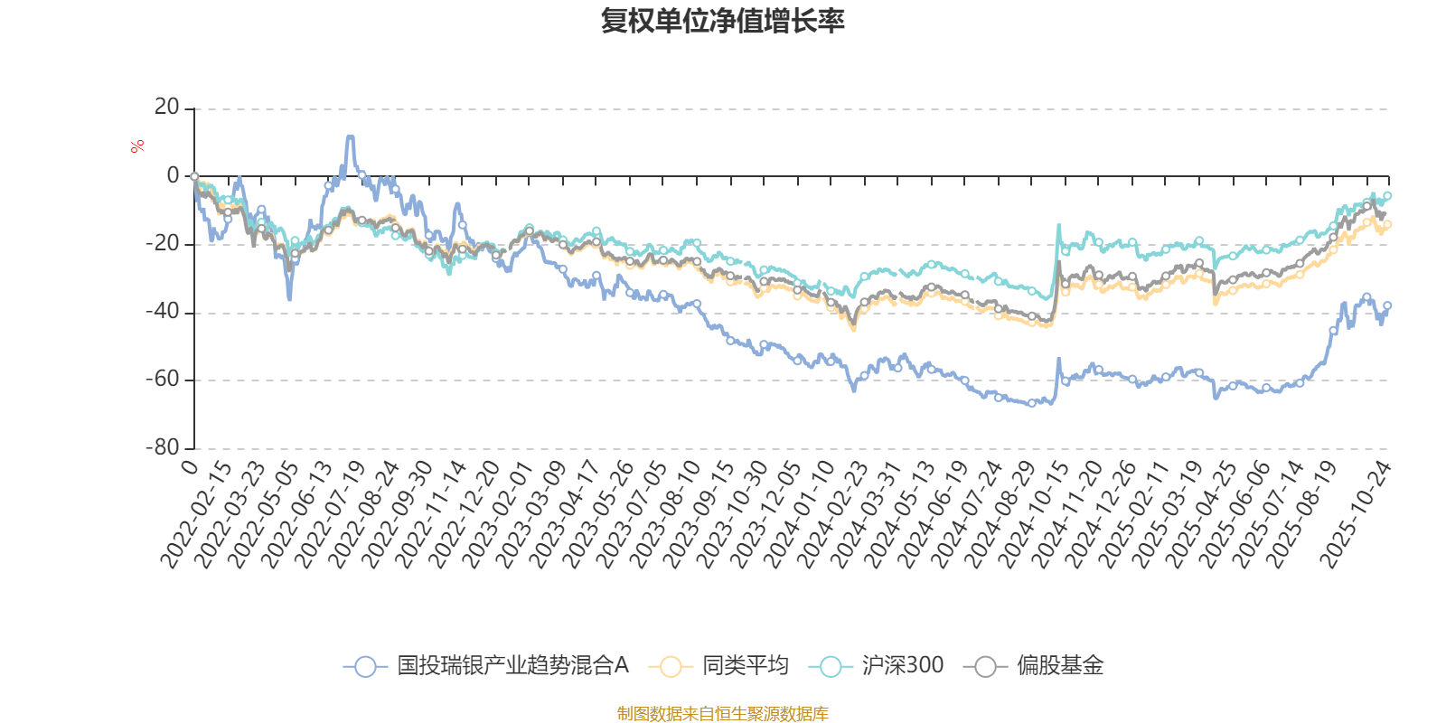 截至10月24日,国投瑞银产业趋势混合A近三个月复权单位净值增长率为51.27%,位于同类可比基金2/185;近半年复权单位净值增长率为62.02%,位于同类可比基金9/185;近一年复权单位净值增长率为54.27%,位于同类可比基金17/181;近三年复权单位净值增长率为-23.38%,位于同类可比基金170/175。