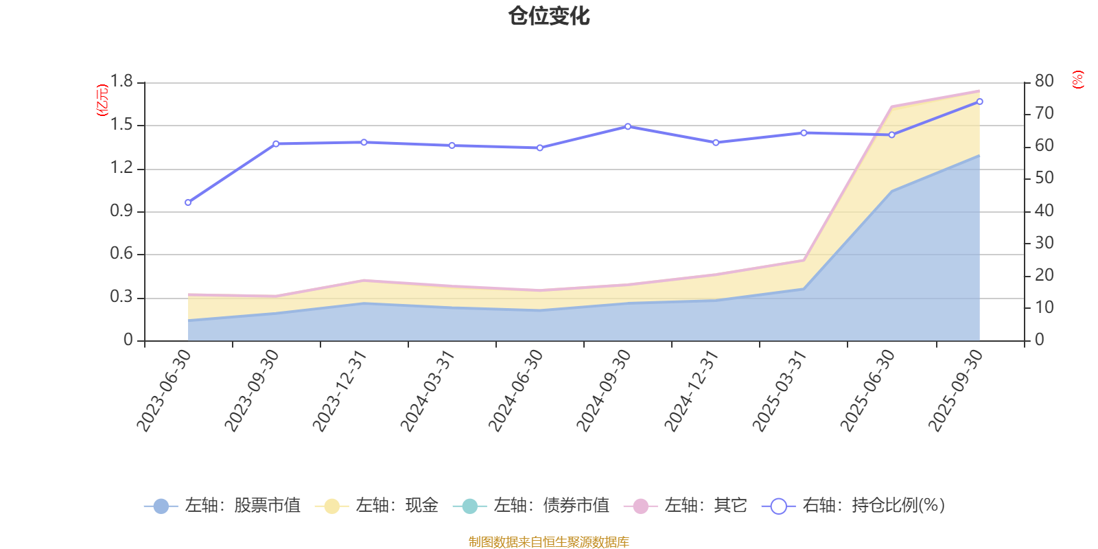 据定期报告数据统计,成立以来平均股票仓位为61.53%,同类平均为85.48%。2025年三季度末基金达到74.06%的最高仓位,2023年上半年末最低,为42.81%。