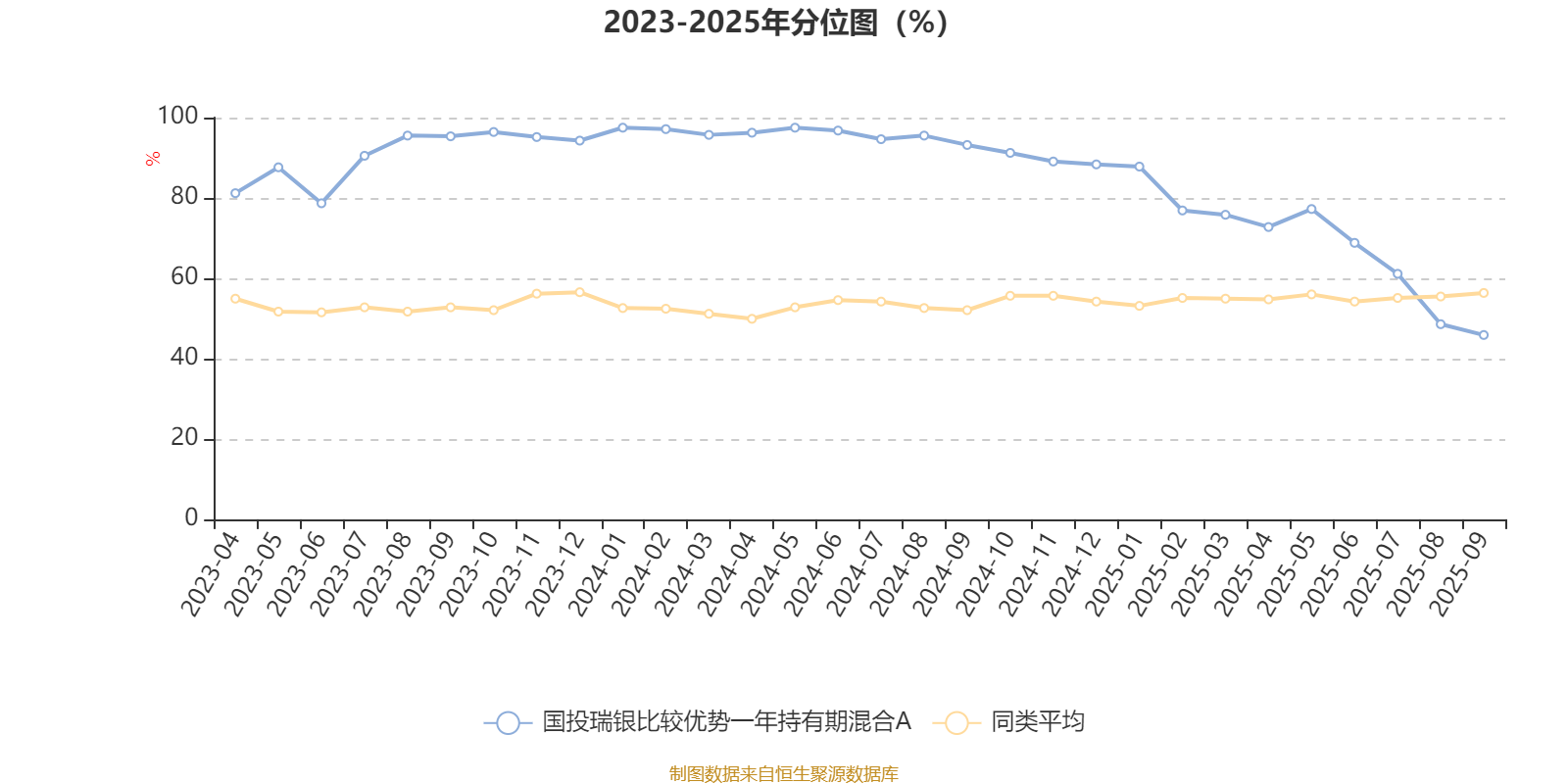 通过所选区间该基金净值增长率分位图,可以观察该基金与同类基金业绩比较情况。图为坐标原点到区间内某时点的净值增长率在同类基金中的分位数。