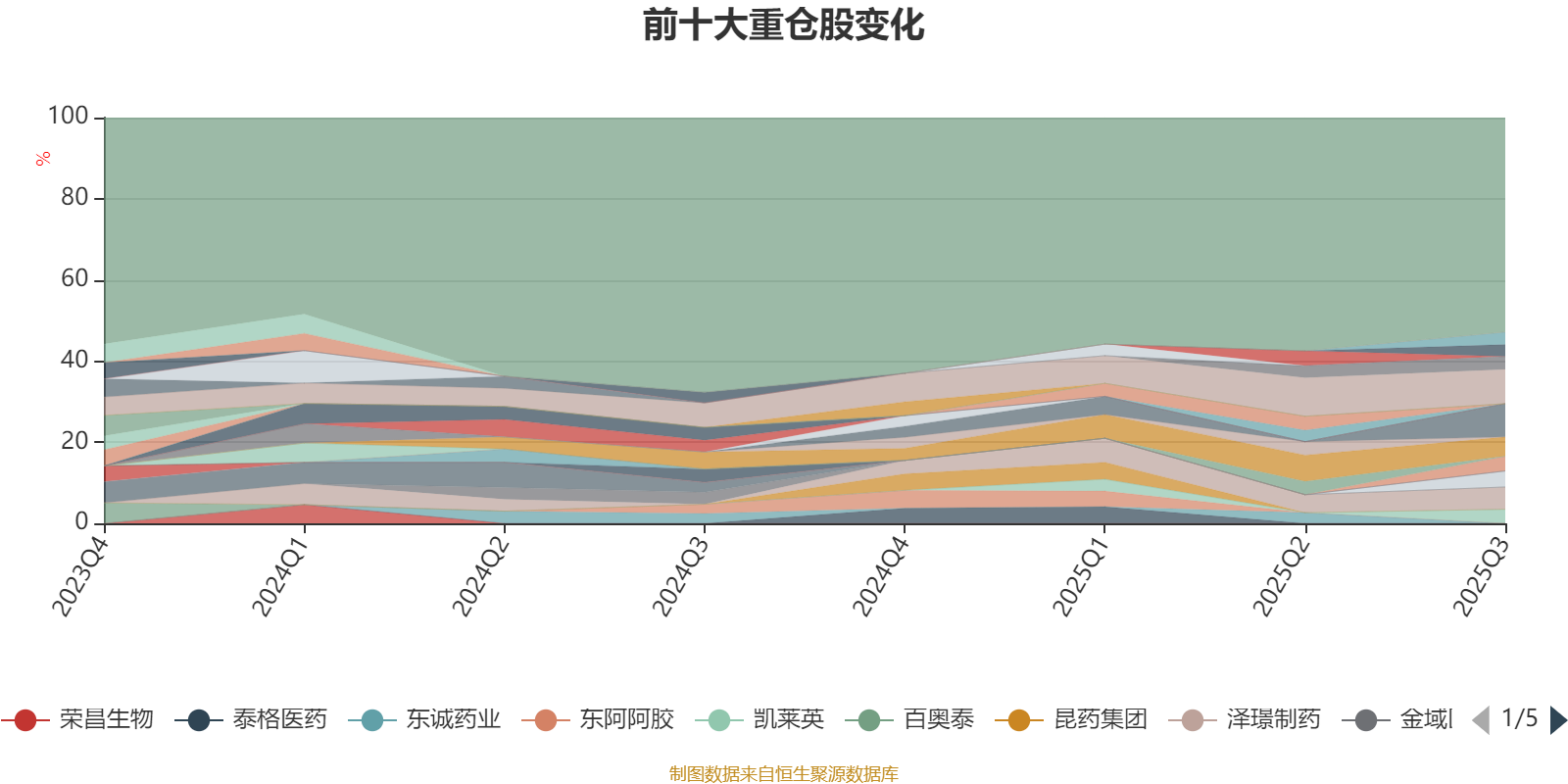 截至2025年三季度末,基金十大重仓股分别是恒瑞医药、药明康德、泽璟制药、科伦药业、百普赛斯、京新药业、凯莱英、华东医药、毕得医药、三生国健。