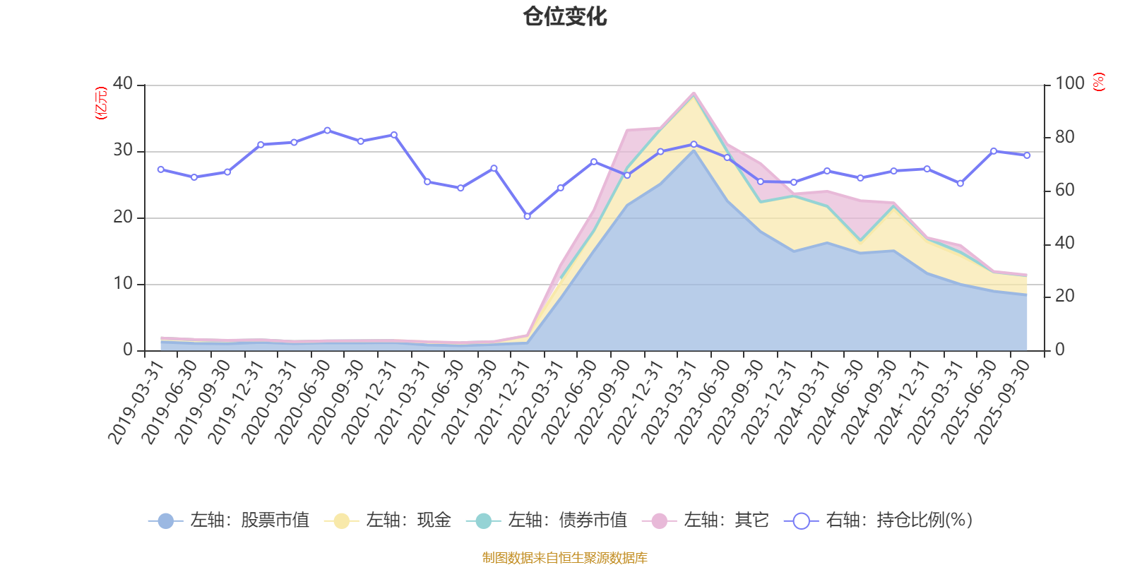据定期报告数据统计,近三年平均股票仓位为69.33%,同类平均为72.18%。2020年上半年末基金达到82.84%的最高仓位,2021年末最低,为50.54%。