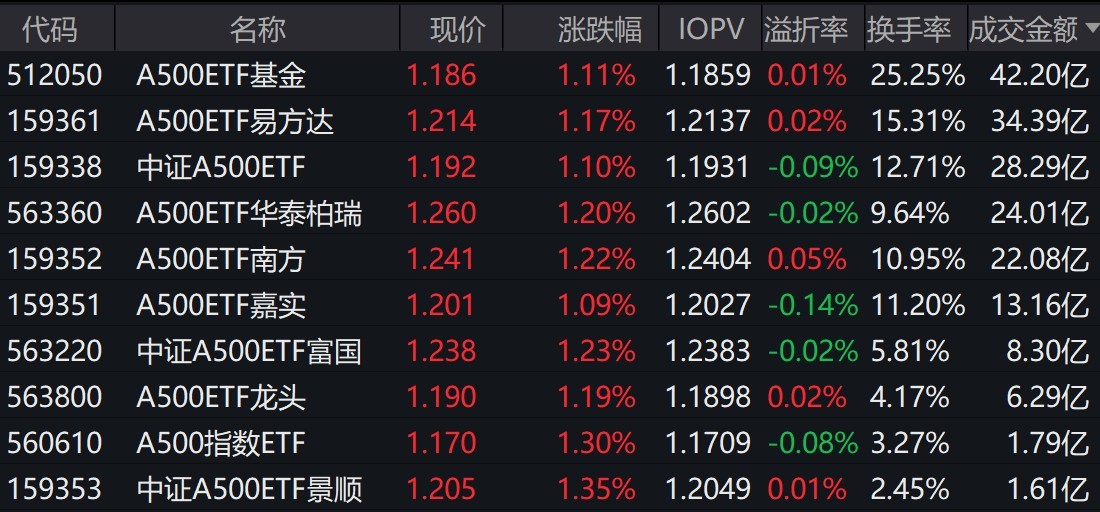 截至上午收盘,场内跟踪中证A500指数的ETF涨超1%。其中,有10只中证A500相关ETF成交额超1亿元,3只超28亿元。A500ETF基金、A500ETF易方达、中证A500ETF早盘成交额分别为42.2亿元、34.39亿元、28.29亿元。