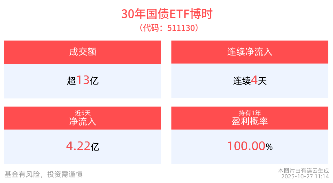 截至2025年10月27日 11:14,30年国债ETF博时(511130)多空胶着,最新报价106.64元。拉长时间看,截至2025年10月24日,30年国债ETF博时近2周累计上涨1.23%。