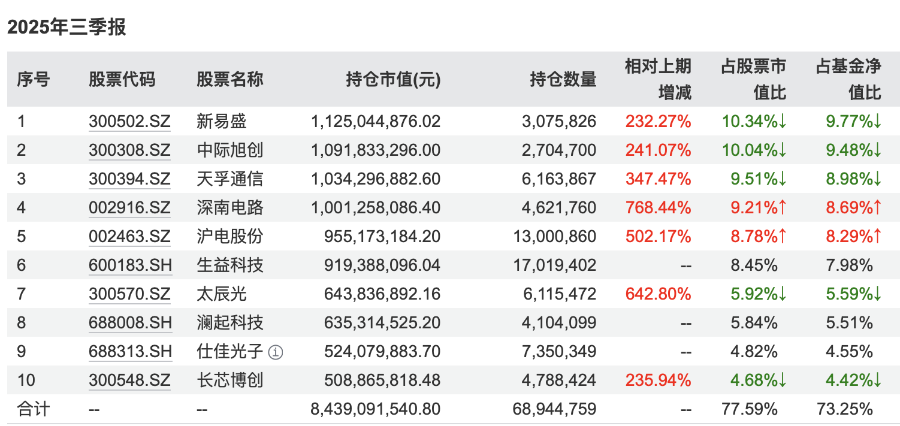 相较今年二季度末,该基金持有新易盛、中际旭创、天孚通信、深南电路、沪电股份的数量分别增加了232.27%、241.07%、347.47%、768.44%、502.17%。