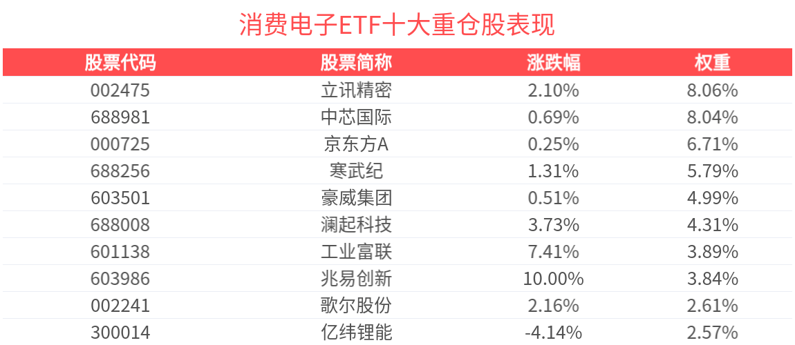 数据显示,截至2025年9月30日,中证消费电子主题指数(931494)前十大权重股分别为立讯精密(002475)、中芯国际(688981)、寒武纪(688256)、工业富联(601138)、澜起科技(688008)、京东方A(000725)、兆易创新(603986)、豪威集团(603501)、亿纬锂能(300014)、华工科技(000988),前十大权重股合计占比55.93%。