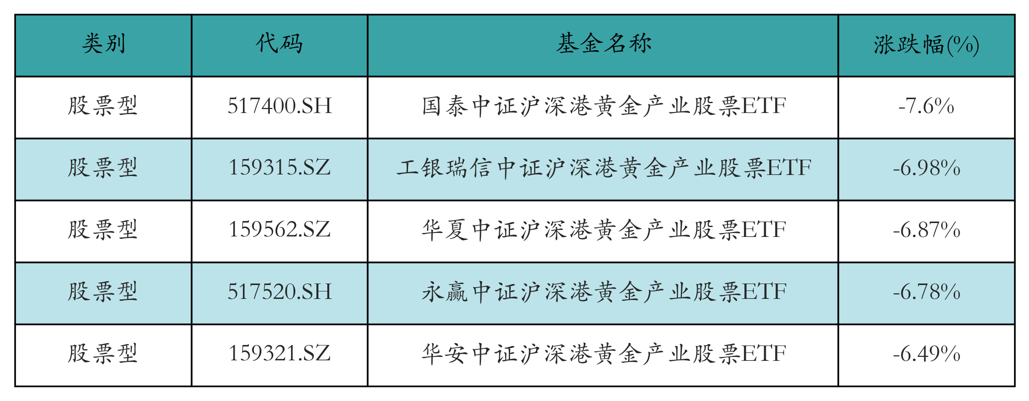 上周股票型ETF跌幅最大的5只ETF及其收益率分别为:国泰中证沪深港黄金产业股票ETF(-7.6%)、工银瑞信中证沪深港黄金产业股票ETF(-6.98%)、华夏中证沪深港黄金产业股票ETF(-6.87%)、永赢中证沪深港黄金产业股票ETF(-6.78%)、华安中证沪深港黄金产业股票ETF(-6.49%)。详情见下表: