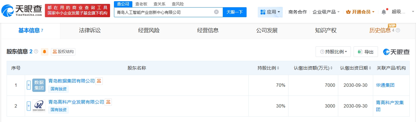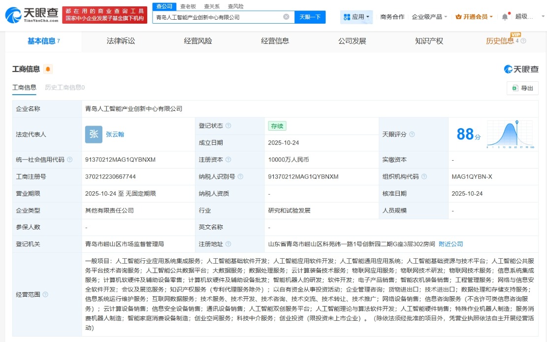 每经AI快讯,天眼查App显示,近日,青岛人工智能产业创新中心有限公司成立,法定代表人为张云翰,注册资本1亿元,经营范围包括人工智能行业应用系统集成服务、人工智能基础软件开发、人工智能应用软件开发、人工智能通用应用系统等。股东信息显示,该公司由青岛数据集团有限公司、青岛高科产业发展有限公司共同持股。