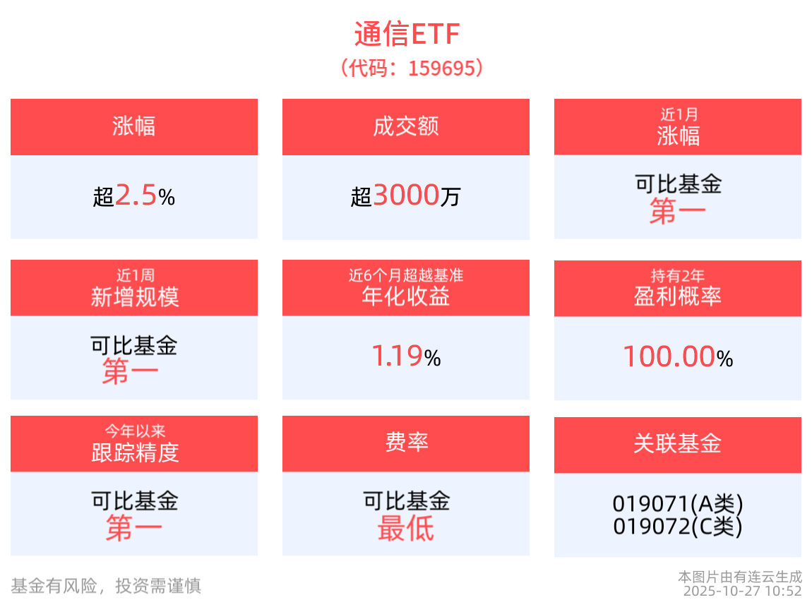截至10月24日,通信ETF近2年净值上涨113.73%,指数股票型基金排名38/2366,居于前1.61%。从收益能力看,截至2025年10月24日,通信ETF自成立以来,最高单月回报为33.97%,最长连涨月数为5个月,最长连涨涨幅为76.35%,上涨月份平均收益率为7.57%。