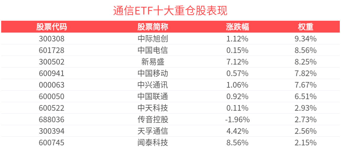 数据显示,截至2025年9月30日,国证通信指数前十大权重股分别为中际旭创、新易盛、中兴通讯、中国电信、中国移动、中国联通、天孚通信、中天科技、传音控股、亨通光电,前十大权重股合计占比66.02%。
