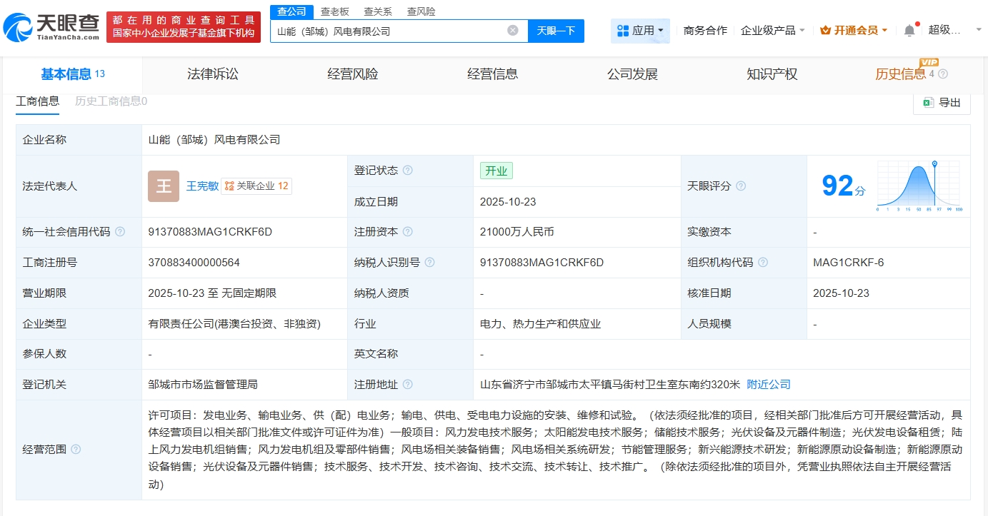 南方财经10月27日电,天眼查App显示,近日,山能(邹城)风电有限公司成立,法定代表人为王宪敏,注册资本2.1亿人民币,经营范围包括风力发电技术服务、太阳能发电技术服务、储能技术服务、光伏设备及元器件制造等。股东信息显示,该公司由山东能源集团新能源集团有限公司、兖矿能源(600188)、兖煤国际(控股)有限公司共同持股。