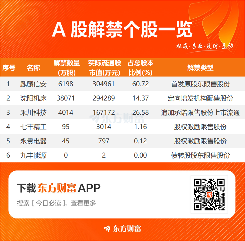 【明日解禁】明日6股解禁 麒麟信安、沈阳机床解禁市值居前