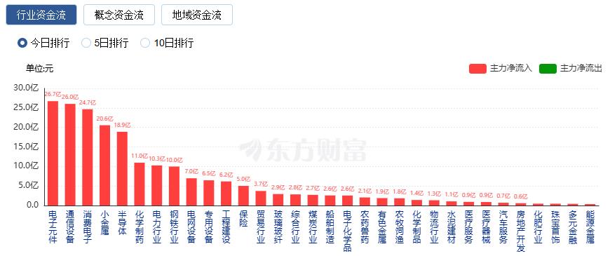 行业资金方面,截至收盘,电子元件、通信设备、消费电子等净流入排名靠前,其中电子元件净流入26.72亿。