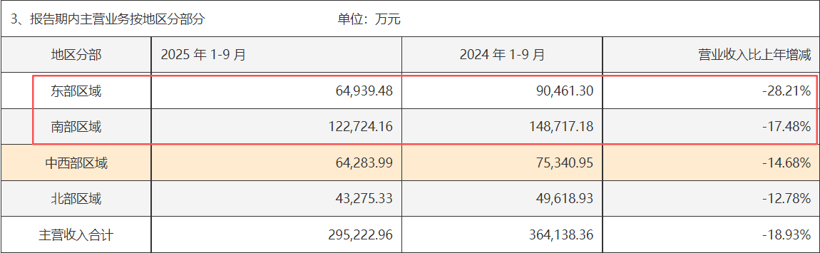截至2025年9月30日,公司在南部区域和东部区域营收下滑程度较大。东部区域营收同比下滑约28%,南部区域营收下滑约17%。