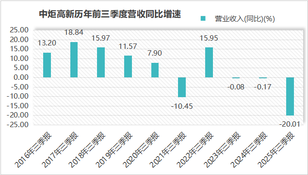 界面新闻发现,公司业绩下滑幅度为近10年之最。自2016年以来,公司仅在2021年前三季度营收同比下滑约10%。2024年前三季度公司营收同比下滑0.17%,到了2025年同比下滑程度超过20%。