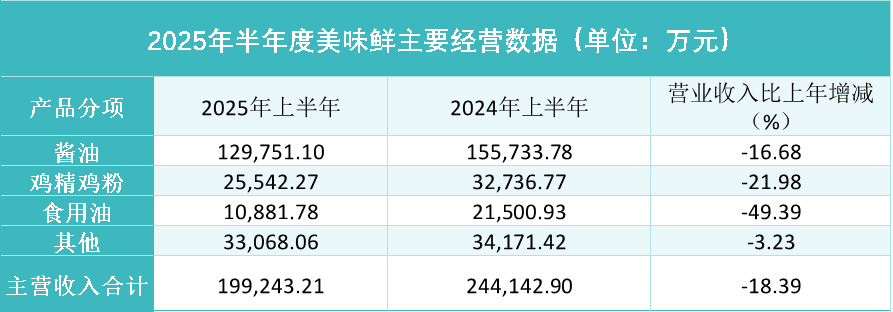 酱油贡献了中炬高新超六成营收,但该品类2025年上半年收入12.98亿元,同比下滑约17%;第二大品类鸡精鸡粉收入2.55亿元,下降约22%;食用油品类收入1.09亿元,大幅下滑49%;而其他调味品也未能形成有效补充,收入3.3亿元,同比下降3.2%。