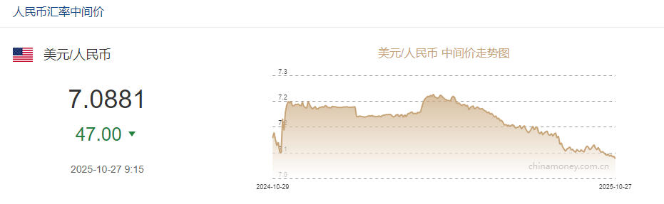 中新网10月27日电据中国外汇交易中心网站消息,中国人民银行授权中国外汇交易中心公布,2025年10月27日银行间外汇市场人民币汇率中间价为:1美元对人民币7.0881元,上调47个基点。