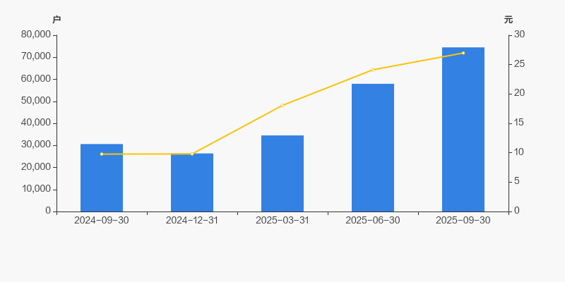 自2024年12月31日以来,公司股东户数连续3期上涨,截至目前增幅为182.64%。2024年12月31日至2025年9月30日区间股价上涨175.44%。
