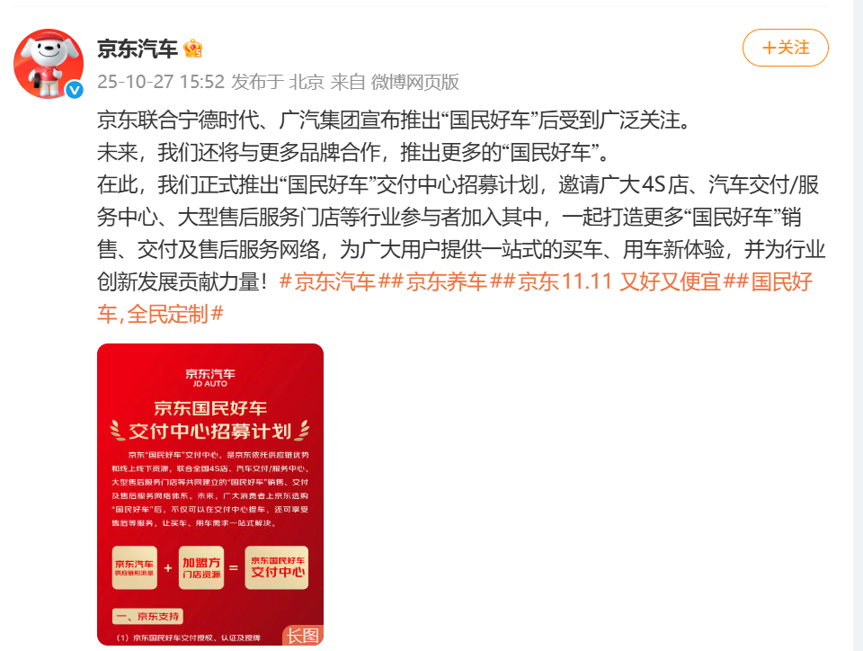 10月27日,@京东汽车宣布启动“国民好车”交付中心全国招募计划。京东汽车将联合广大4S店、汽车交付/服务中心、大型售后服务门店等构建“国民好车”销售、交付及售后服务网络。