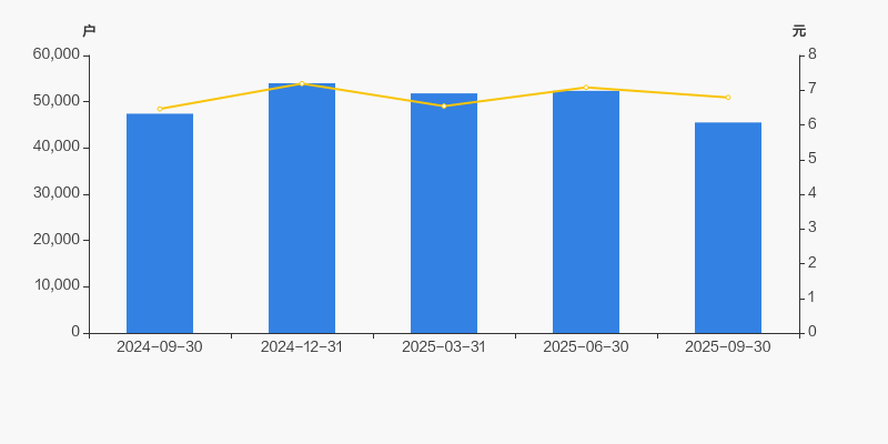 截至2025年9月30日,公司最新总股本为6.31亿股,其中流通股本为5.05亿股。户均持有流通股数量由上期的9280股上升至1.11万股,户均流通市值7.54万元。