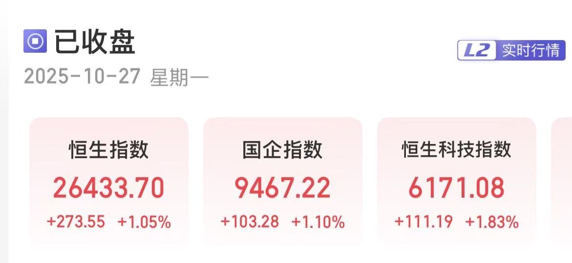 上证报中国证券网讯(刘禹希记者严晓菲)10月27日,港股三大指数集体收涨。截至收盘,恒生指数涨1.05%,报26433.70点;恒生国企指数涨1.10%,报9467.22点;恒生科技指数涨1.83%,报6171.08点。