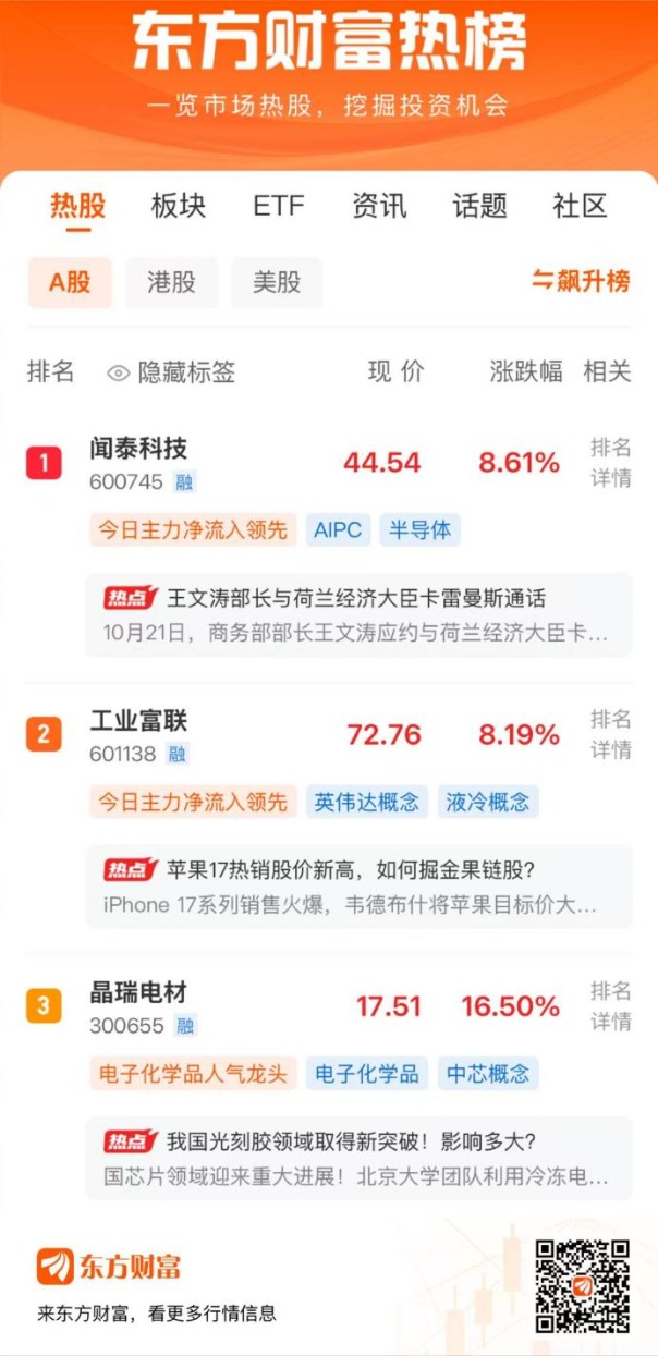 10月27日,两市高开高走,三大指数均涨超1%。东方财富热股榜前三的股票中,闻泰科技位列第1,工业富联位列第2,晶瑞电材位列第3。