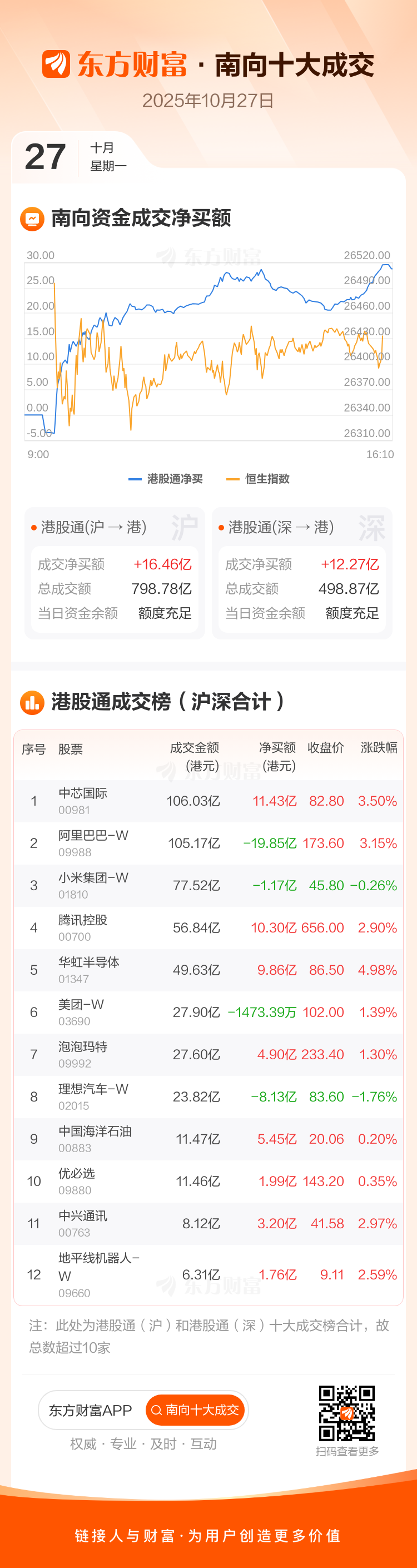10月27日南向资金净买逾28亿港元,逾11亿抢筹中芯国际